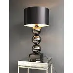 De bollamp met blokvoet in antraciet is een stijlvolle en moderne tafellamp die direct opvalt. De drie metalen bollen vormen samen een krachtig design, terwijl de satijn zwarte kap zorgt voor een warme en sfeervolle lichtverdeling. Met zijn robuuste uitstraling en luxe afwerking is deze lamp perfect als statement piece op een dressoir, bijzettafel of in de woonkamer.