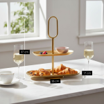 De opstaande randen zorgen ervoor dat alles netjes op zijn plek blijft liggen, terwijl de handgreep aan de bovenkant het eenvoudig maakt om de etagère te verplaatsen. Het metalen ontwerp geeft de etagère een elegante en moderne uitstraling, waardoor hij perfect past op een eettafel, dressoir of keukenblad.
