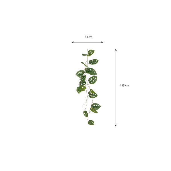 De slinger is voorzien van realistische Monstera bladeren in verschillende groentinten en maten, waardoor hij een natuurlijke en levendige uitstraling heeft. Met een lengte van 115 cm is deze decoratieve slinger perfect om te draperen over een kast, plank, tafel of wandrek. Dankzij het onderhoudsvrije ontwerp blijft de plant altijd mooi groen zonder water geven of verzorging. De flexibele takken maken het eenvoudig om de slinger naar wens te stylen en te combineren met andere kunstplanten of decoratie.